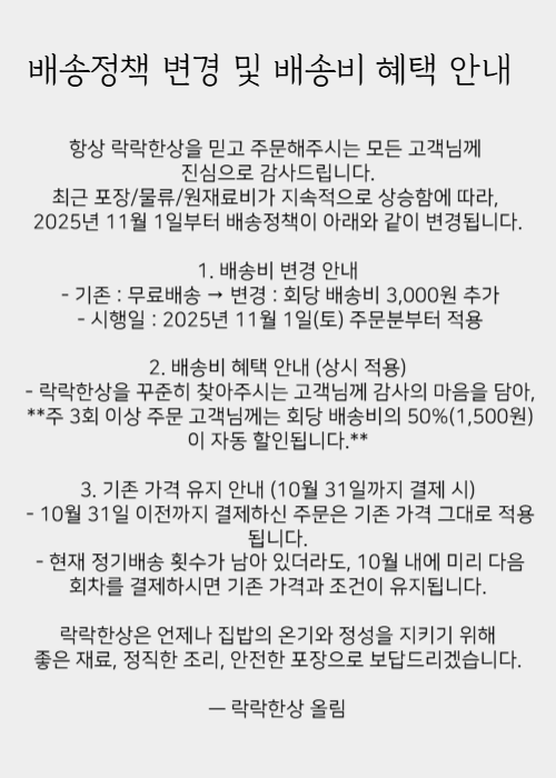 * 일요일 및 공휴일 휴무카카오톡 @락락한상 친구 추가하고 다양한 소식과 혜택을 받아보세요.