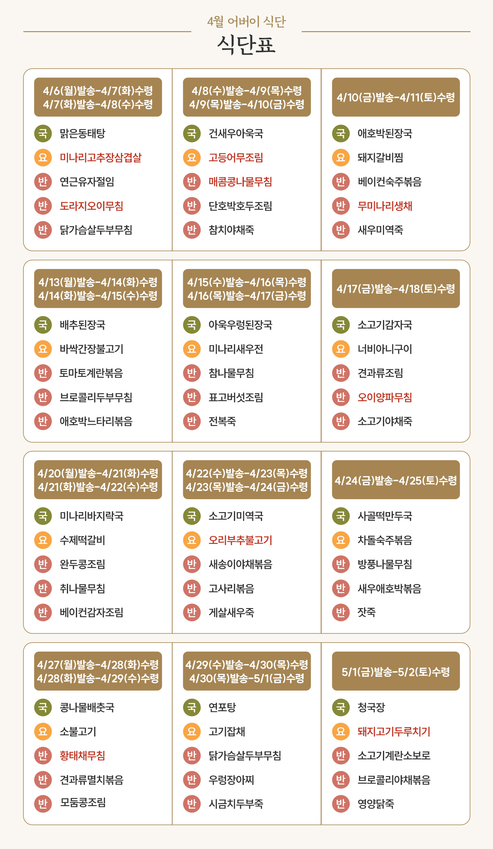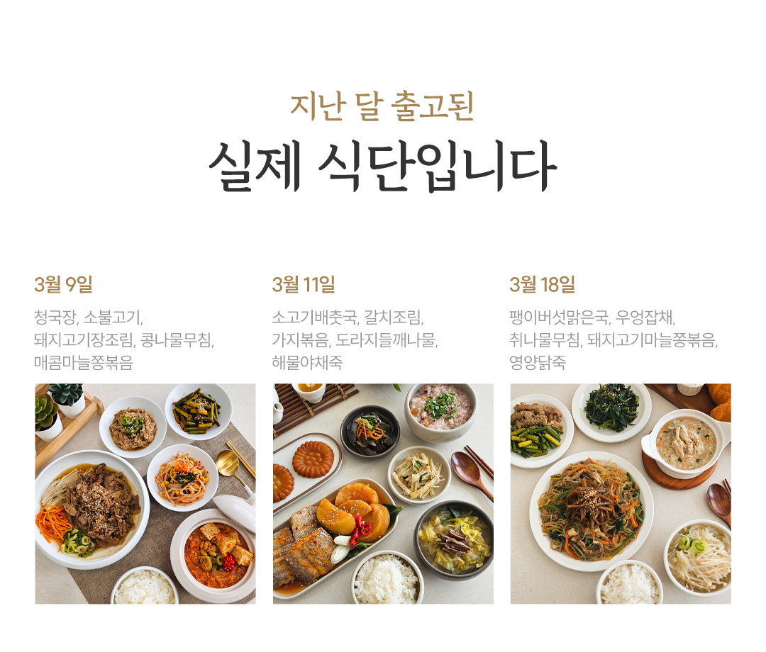 구성 : 국 1개, 요리 1개, 반찬 3개 (주 2회 "죽"메뉴 포함)